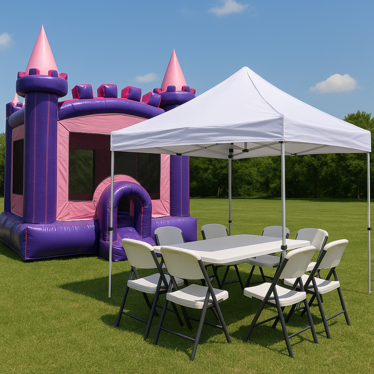The Party Package rental brings together a set of fun and festive essentials designed to turn any event into a memorable celebration. It simplifies your party planning by offering a complete kit featuring bounce house, tent, table and chairs, and inflatable 4ft tall Party Decor.