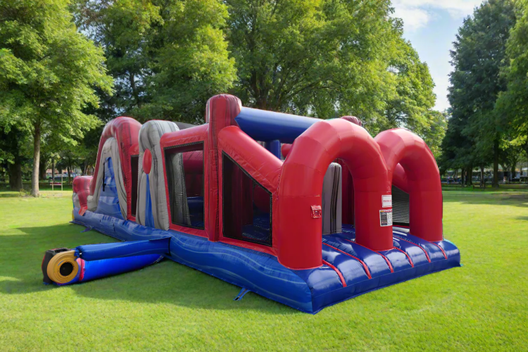 Race through this unique 38' Blazin Obstacle Course Wet/Dry inflatable race course. This obstacle course is a fun and exciting race course for kids to adults of all ages. Use the obstacle course year round with water slide feature and water misting system for the hot Summer months, and during the colder seasons you can use as a dry obstacle course. Manufactured with commercial grade PVC vinyl for the commercial party rental or indoor play center industry, or even for private backyard use, it is made with great quality and workmanship.