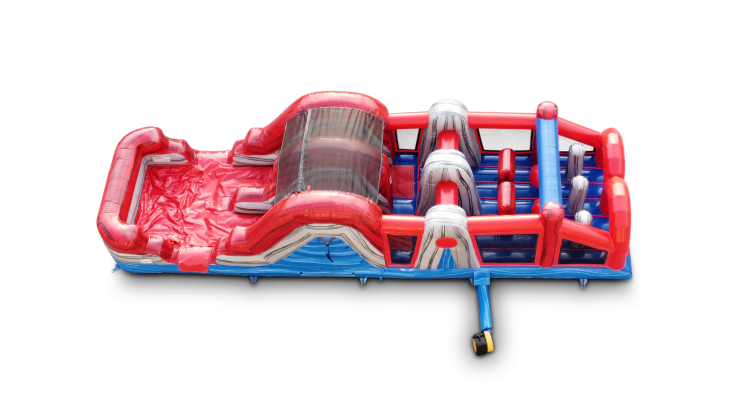 Race through 7 different elements. Riders start off by going through the entrance (1) red arches, then through the (2) vertical popups, under the (3) hanging wrecking balls, around the (4) T shaped popups, through the (5) horizontal popups, up the (6) dual lane climber and down the (7) dual lane slide. The pool area is an inflated landing zone which can be filled with water to create a splash zone or left empty when using it as a dry inflatable obstacle course.
